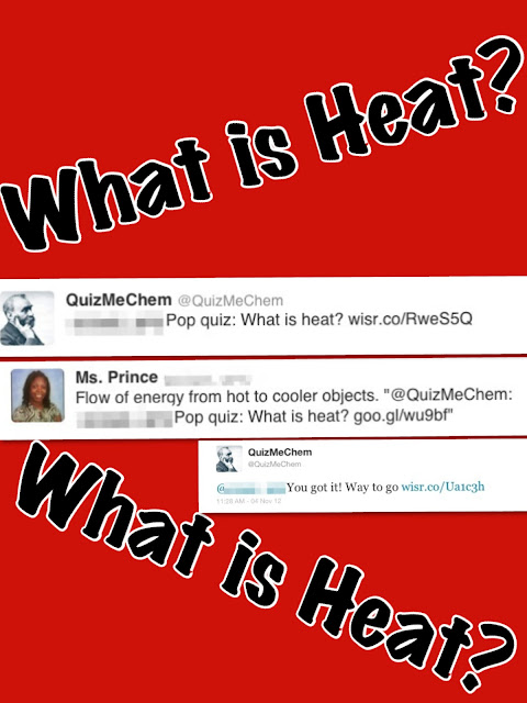On Saturday, I received a direct message from @QuizMeChem. Typically, they send out general messages asking chemistry questions. (This means, that if you plan on taking chemistry in high school you may want to follow these folks on Twitter.) Well, instead of me answering one of their general questions, they decided to give me a POP QUIZ! The question they asked me could not have come at a better time. Our topic is on heat this week and how it is transferred. So if I were to ask you to describe heat, what would you say? Well, this was the question I was asked and hear is how I responded: